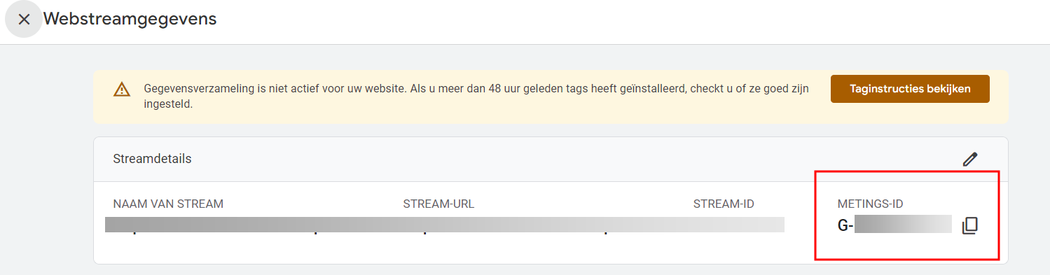 Het GA4 Measurement ID kan je vinden door in de juiste GA4 property naar het beheer toe te gaan en hier op 'Gegevenstreams' te klikken. Klik op de gegevensstream, je ziet dan je 'Metings-ID' in de rechterbovenhoek. Volg deze stappen om dit ID toe te voegen aan je setup binnen GTM.