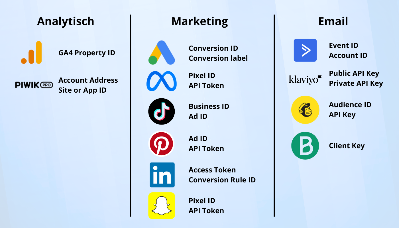 Het juist opzetten van Server-Side Tagging en andere tracking is afhankelijk wat je van je klant kunt verwachten en welke platformen jij en zij (willen) gebruiken. Voordat je begint met een Server-Side Tagging implementatie is het belangrijk om van te voren te weten welke platformen wel een API hebben die server side gebeurtenissen kunnen ontvangen, en welke platformen je via een script of Client-Side Tagging instelt/laat staan. Onderstaand kan je een overzicht vinden van de meest ingestelde platformen en wat de benodigdheden zijn om dit in te stellen. Mocht je zelf dus geen toegang hebben tot bepaalde platformen van je klant, dan kan je hier vinden wat je bij hen op moet vragen.