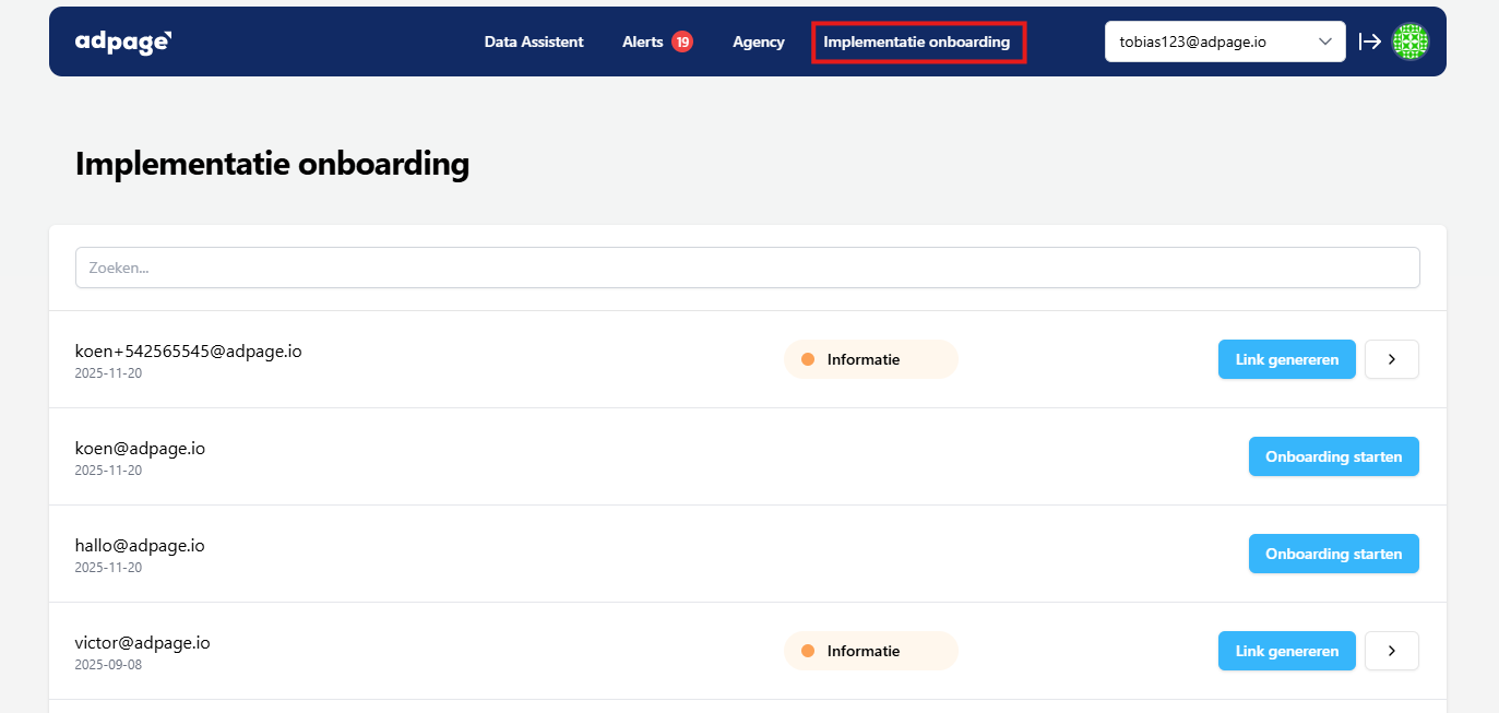 In het implementatie onboarding overzicht krijg je een overzicht van jouw klant-accounts. Voor deze klant-accounts kan je de klant-onboardings starten en inzien.