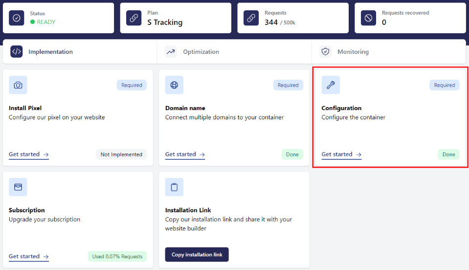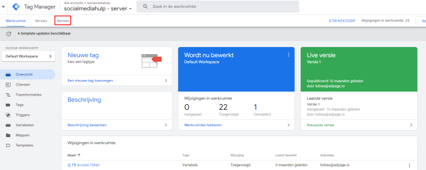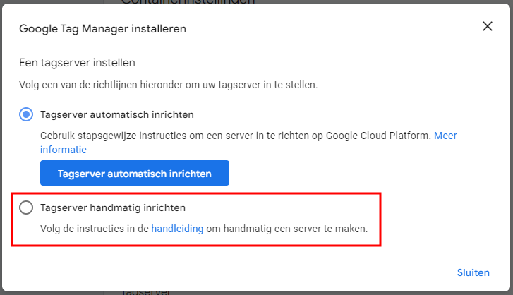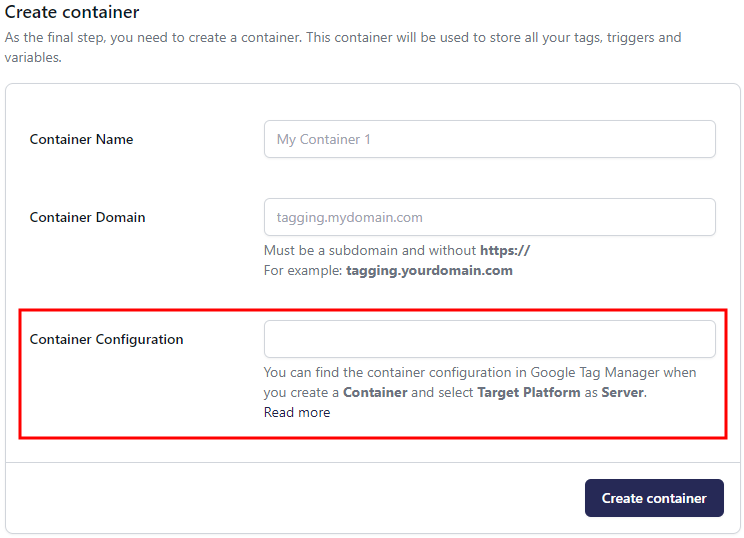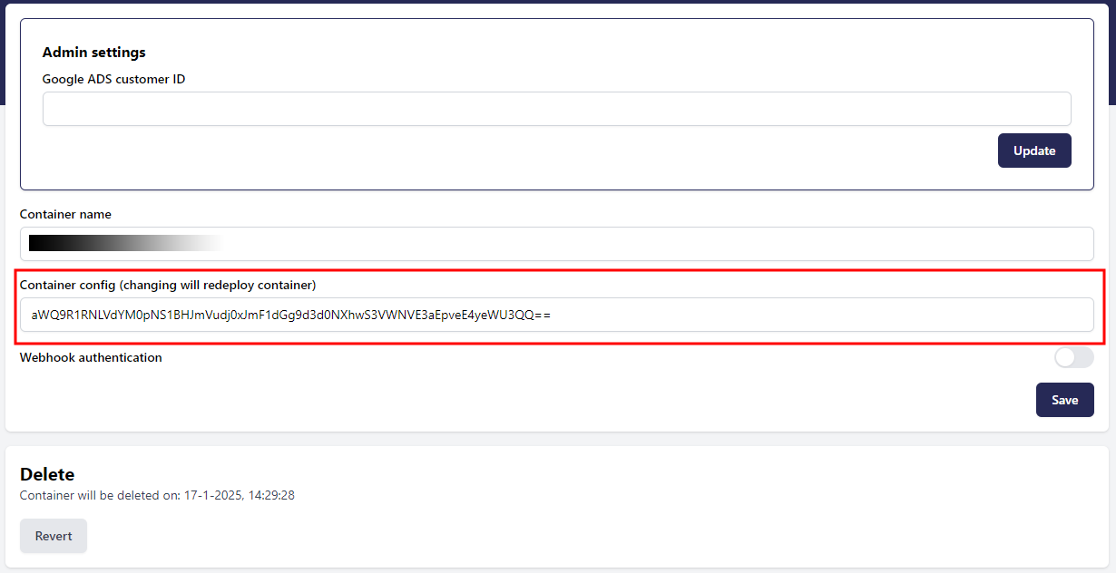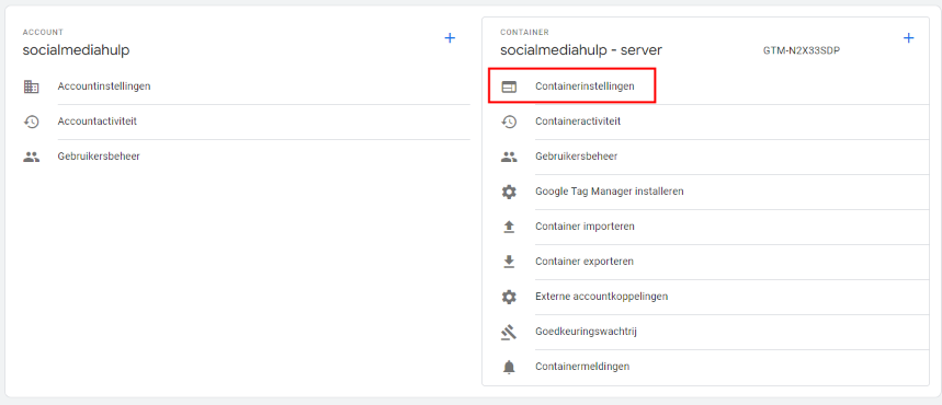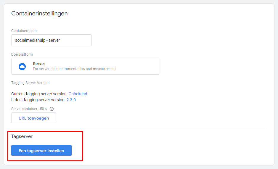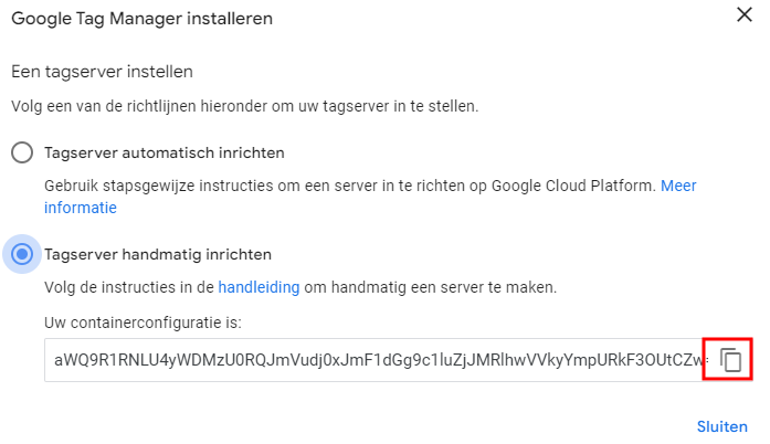 Om je container op trytagging te configureren met je server container op GTM, heb je een containerconfiguratie nodig. Deze containerconfiguratie vind je in je sGTM container en plak je in je trytagging container.