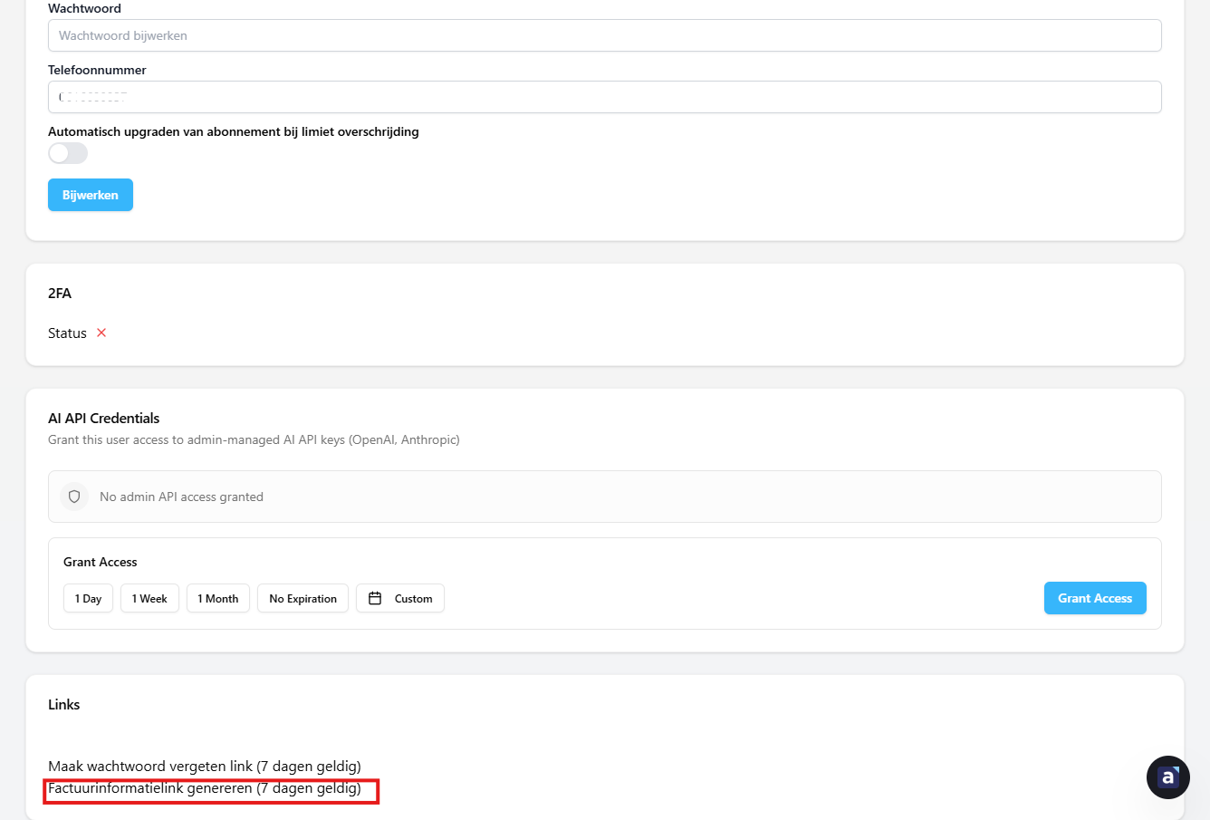 Nieuwe factuur informatie link genereren