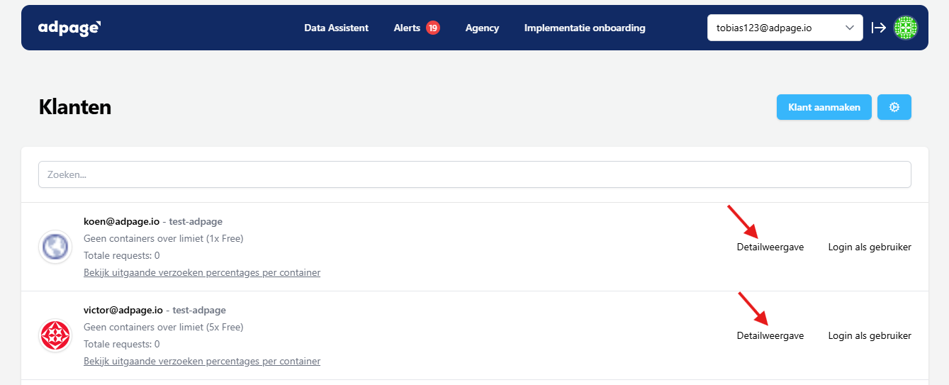 In de lijst van jouw klanten kan je inloggen om de container(s) te beheren, maar nu kies je voor de Detailweergave optie.