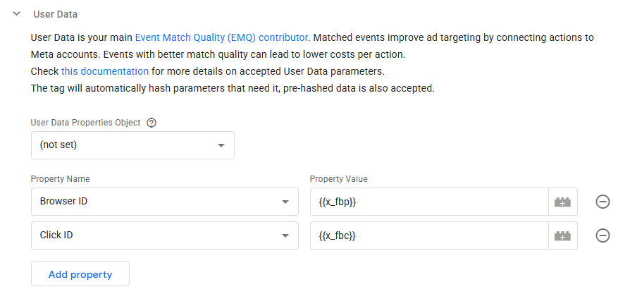 Voeg twee nieuwe properties toe aan deze user data opties. De eerste is Browser ID en de tweede is Click ID. Als waarde geef je deze properties de variabelen voor de FBC en FBP parameters in je Google Tag.