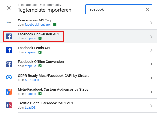 Gebruik de zoekfunctie om te zoeken naar de Facebook Conversion API tag template. Voeg deze toe aan je werkruimte.
