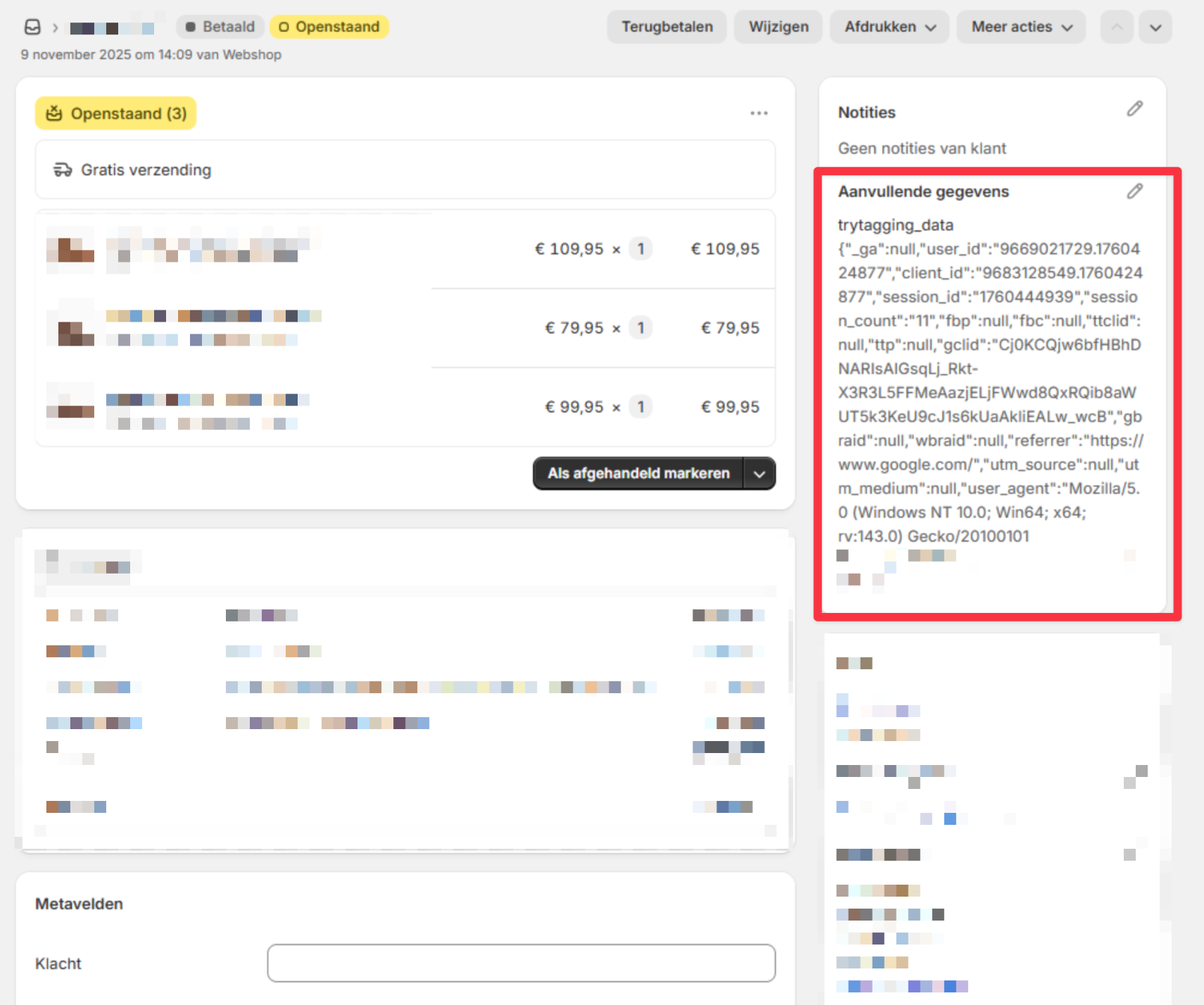 ⚠️ Let op: Order notes worden nu gebruikt voor technische trackingdata. Je wilt niet dat klanten de ruwe marketing JSON data zien op hun checkout, e-mails, facturen of pakbonnen!