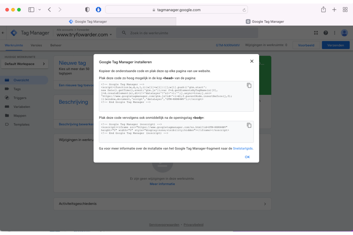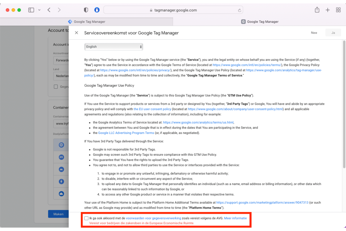 Accepteer de Serviceovereenkomst van Google Tag Manager.