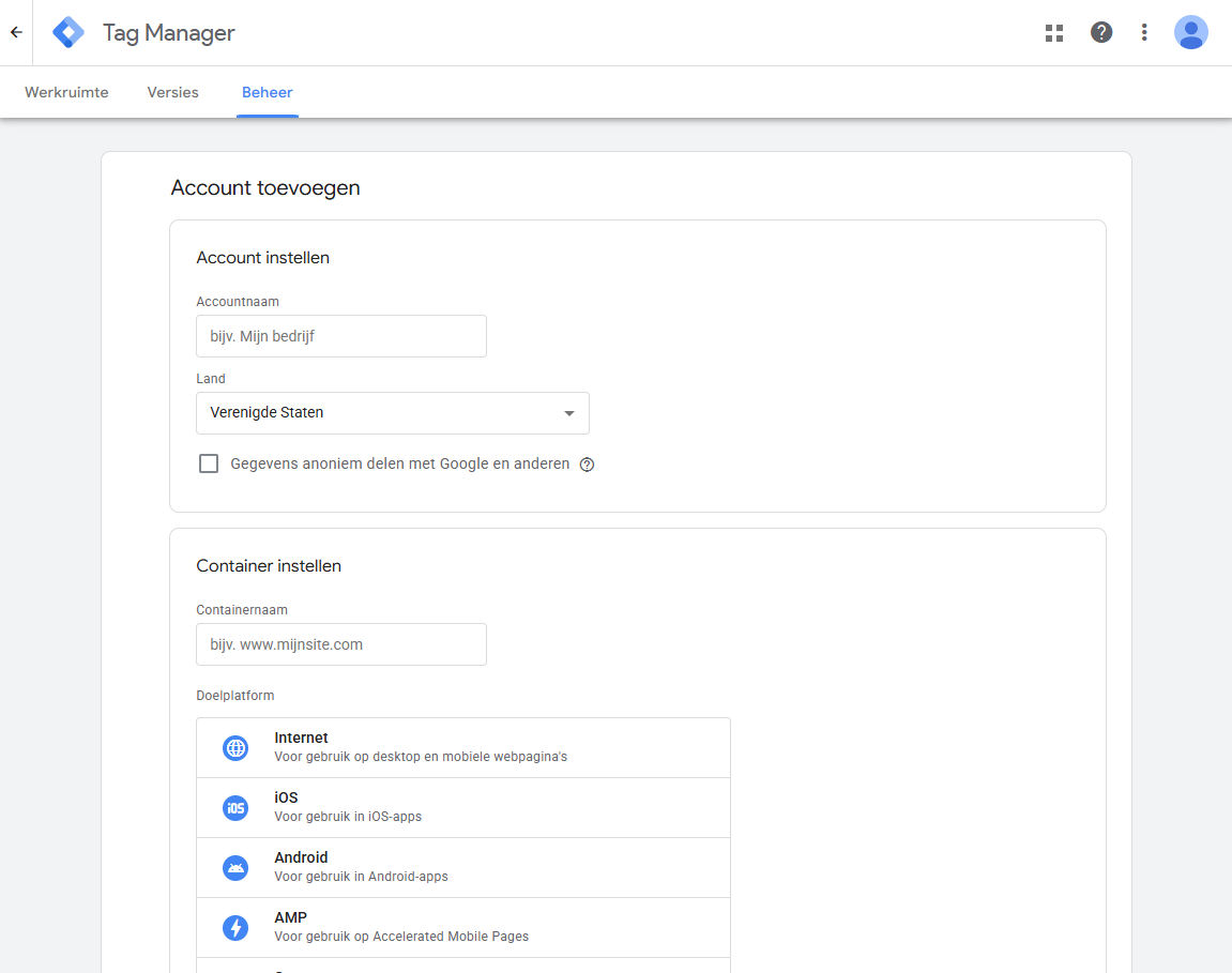 Volg deze stappen om je Google Tag Manager account en webcontainer aan te maken: