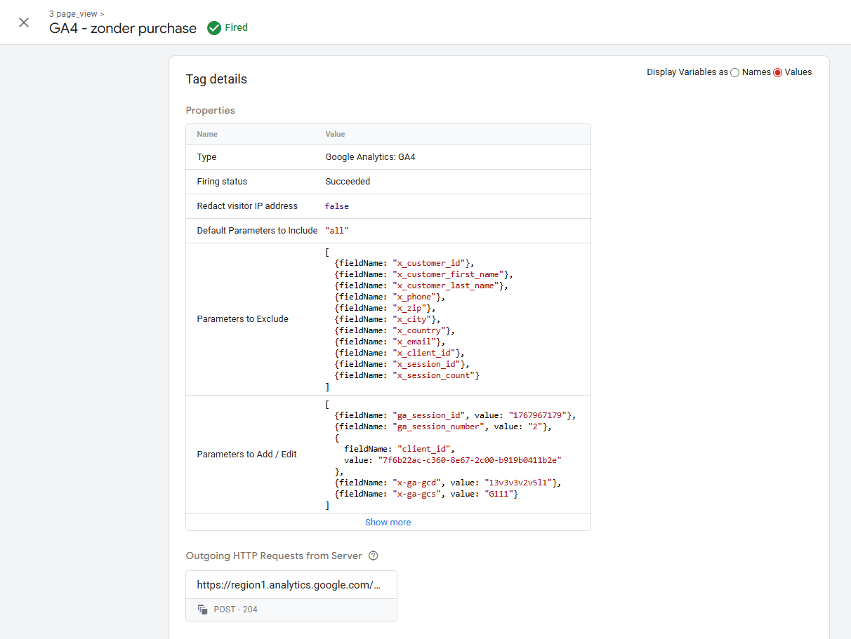 Als je dus een tag ingesteld hebt staan op je server container met een trigger voor een specifieke gebeurtenis kan je via deze preview mode dus testen of de tag geactiveerd wordt. Bij het openklikken van de geactiveerde tag in de preview mode kan je ook inzien welke parameters er meegestuurd wordt en hoe de rauwe uitgaande request er uit ziet.