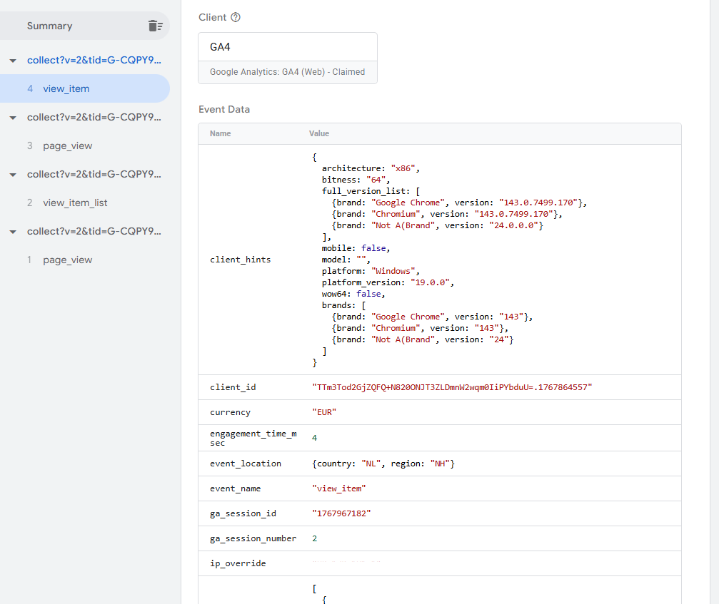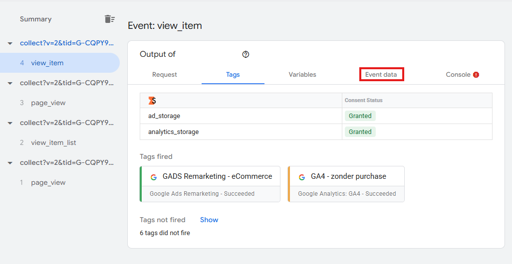 In het linkeroverzicht zie je de binnenkomende requests op chronologische volgorde, de GA4 client maakt er direct een behapbare gebeurtenis van. In het rechteroverzicht kan je de Tags zien die bij het arriveren van de gebeurtenis geactiveerd worden. Ook kan je kijken hoe de Variabelen gevuld worden, hoe de Event Data van de binnenkomende request er uit ziet en of er Console Errors zijn.