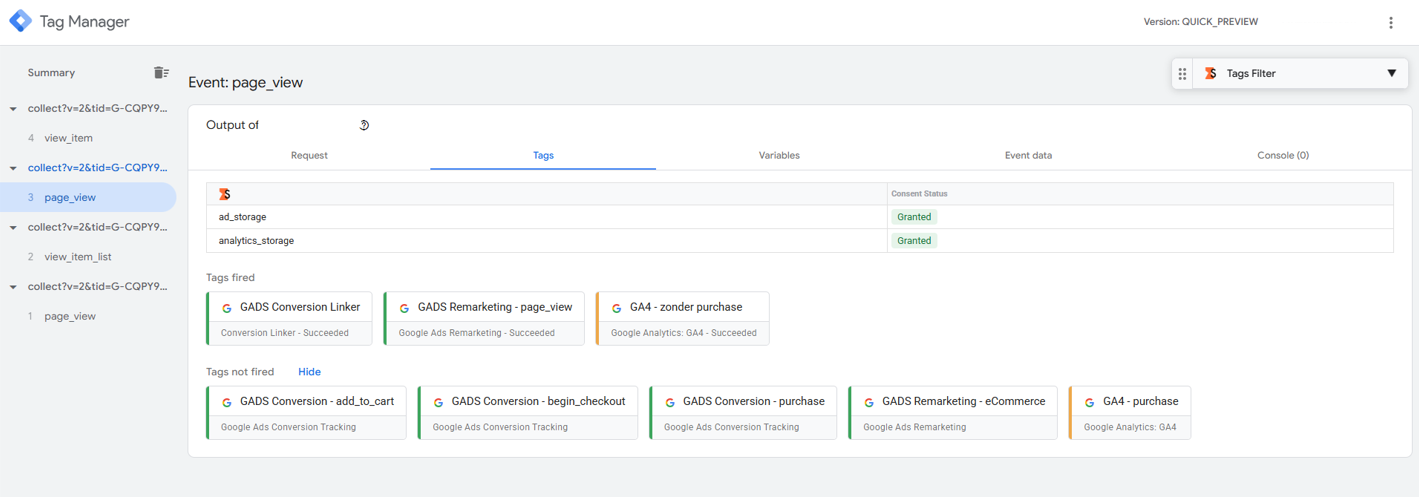 Als je je site opent in de testomgeving van de preview modus, kun je al je aanpassingen nagaan en de gebeurtenissen uitvoeren. Binnen de preview modus kun je bijhouden welke tags wel en niet worden uitgevoerd.