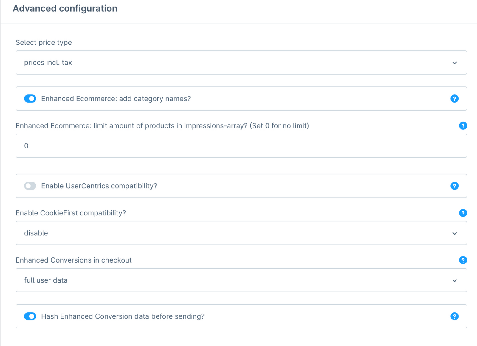 Zet alles uit behalve enhanced ecommerce en hash enhanced conversion.