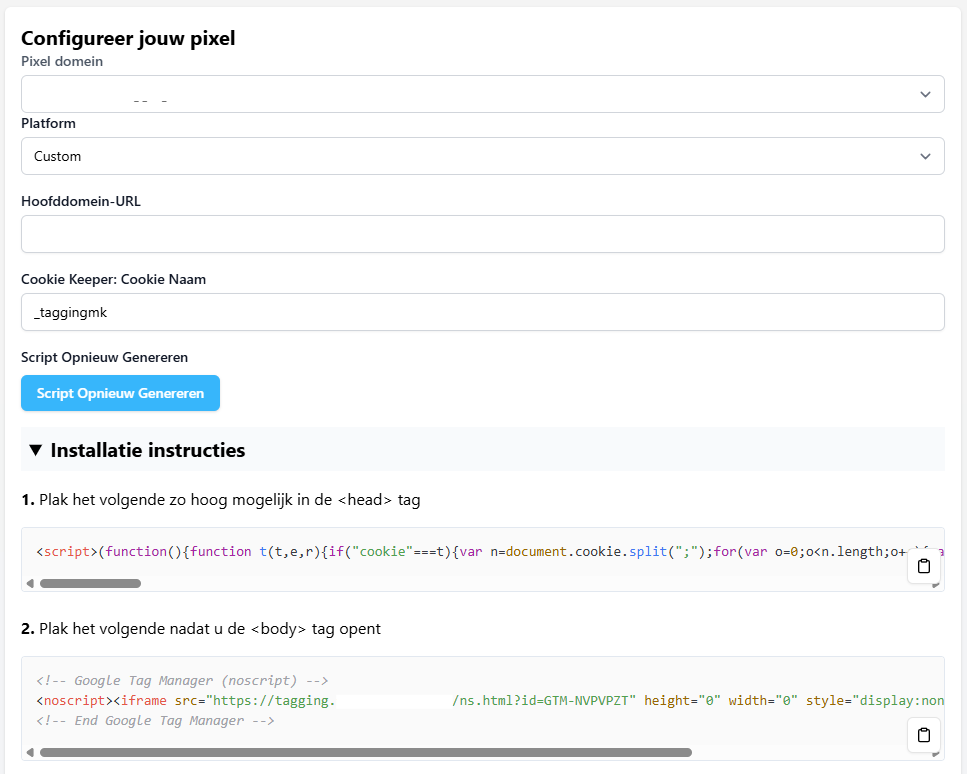 Binnen je trytagging-omgeving kan je de instructies genereren voor een tagging pixel. Een tagging pixel is een gemodificeerde versie van een standaard Google Tag Manager script waarmee je ook AdBlocker-gebruikers kan tracken.