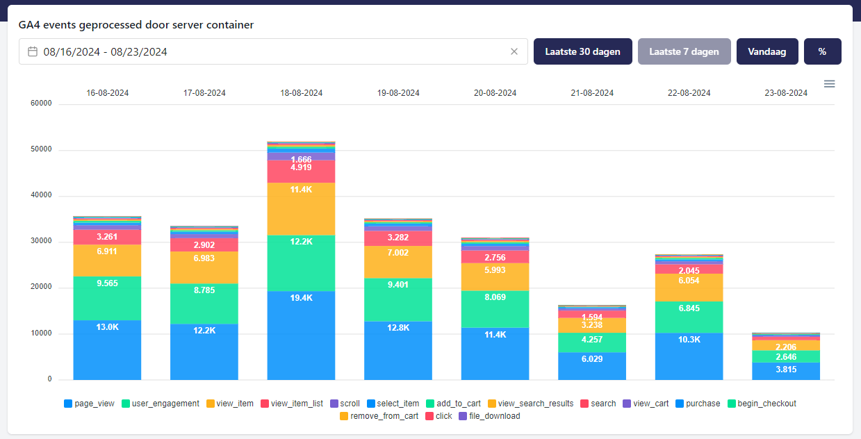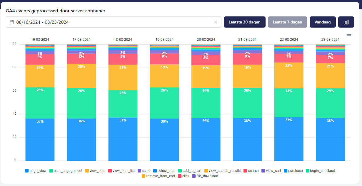 Naast het aantal verwerkte gebeurtenissen kun je via de percentage-knop ook gemakkelijker de verhoudingen voor de verschillende dagen zien. Als er geen grote verschillen of fouten in je tracking setup zijn, blijft de procentuele verhouding tussen de meest verwerkte gebeurtenissen relatief gelijk.