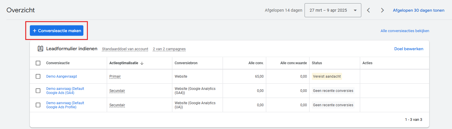 Open je Google Ads account. Selecteer Conversies > Overzicht onder Doelen, waarmee de conversieactiestabel wordt geopend.