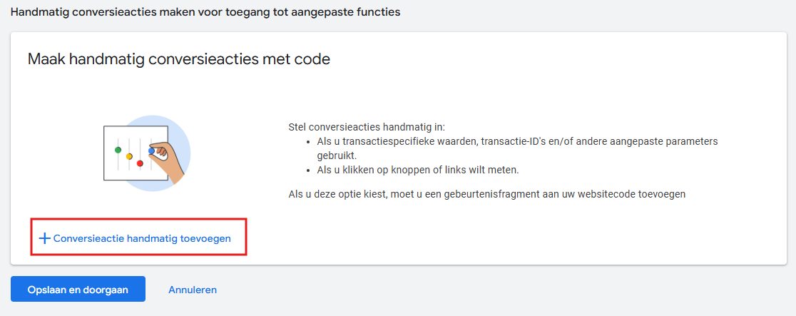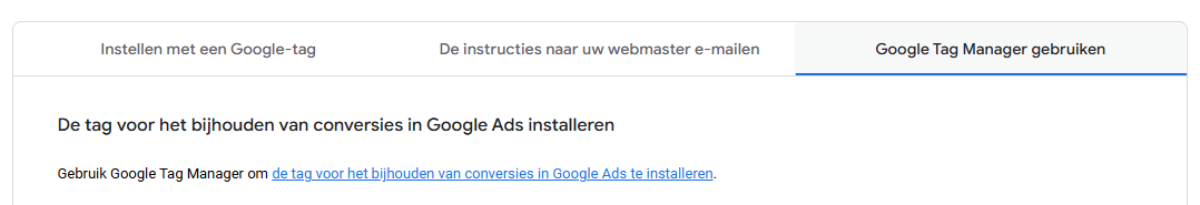 Zorg ervoor dat je de conversieactie handmatig aanmaakt, en niet via de Google Tag aan laat maken.