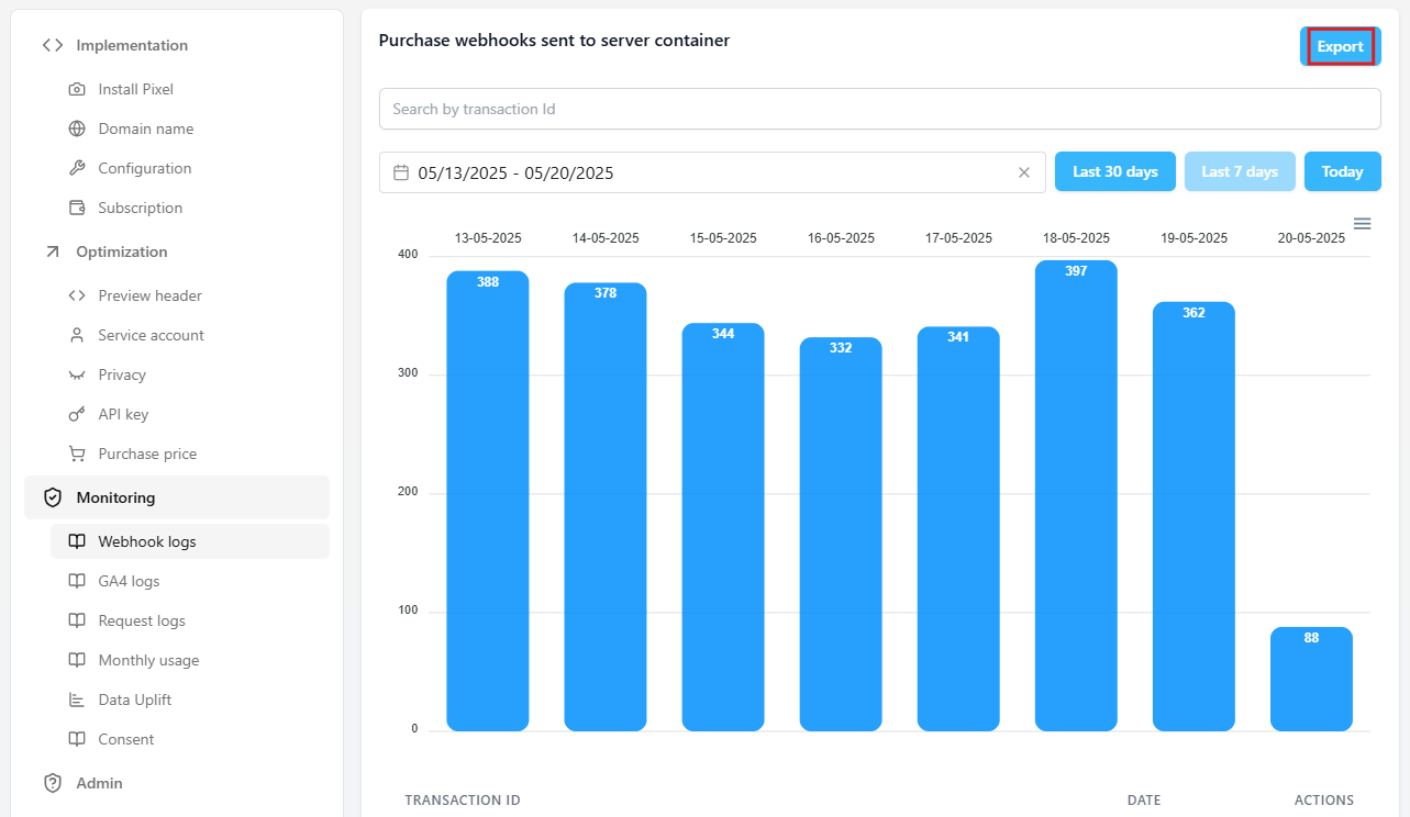 Klik op 'Export' om de ontvangen webhooks te exporteren naar een CSV-bestand.