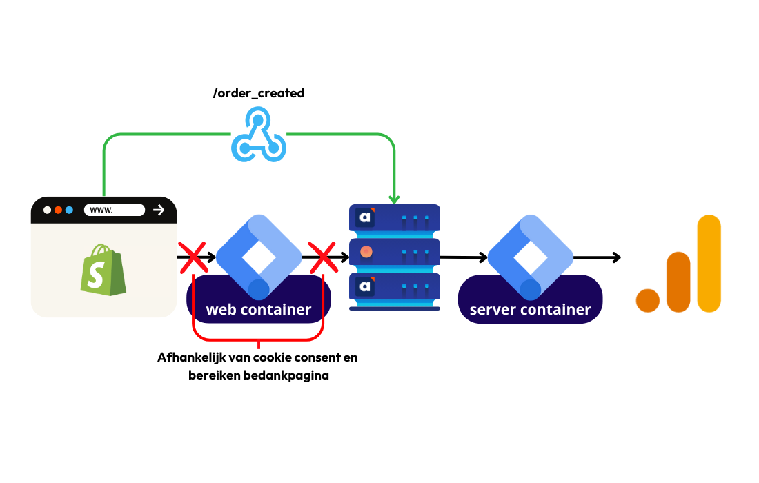 Er is altijd een kans dat een bezoeker via Google Tag Manager (GTM) en de Google Tag niet herkend wordt. Vaak is het zo dat ongeveer 20% van de totale backend orders niet kan worden gekoppeld aan een sessie die interactie met de website heeft gehad. Dankzij de webhooks kunnen echter alle 100% van de aankopen in GA4 alsnog worden geregistreerd. Dit betekent dat 80% van de aankopen via consent en GTM tracking is herkend, terwijl 20% bijvoorbeeld via de backend webhook in GA4 is opgevuld.