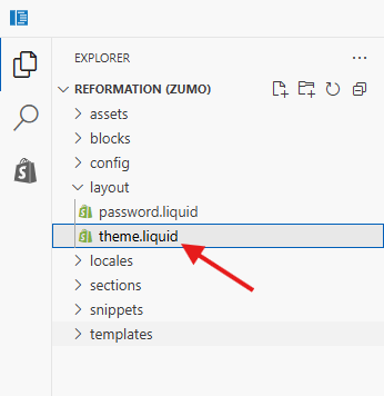 4. In de linker sidebar ga je naar theme.liquid (onder Layout)