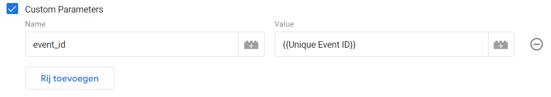 Vink Custom Parameters aan, voeg een rij toe. Als naam van deze custom parameter vul je event_id in en als waarde vul je je Unique Event ID variabele in.