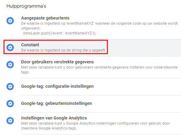 Maak een nieuwe Door de gebruiker gedefinieerde variabele aan en kies Constant als variabele type.