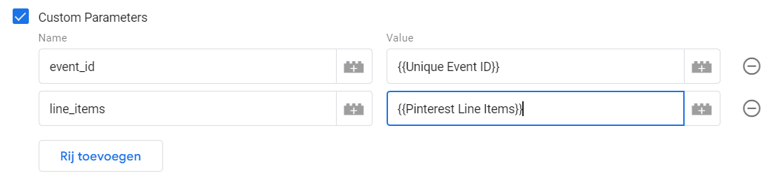 Bij Add To Cart en Checkout events mag je ook een extra rij toevoegen in de Custom Parameters. Als naam vul je line_items in en als waarde voeg je de Pinterest Line Items variabele toe.