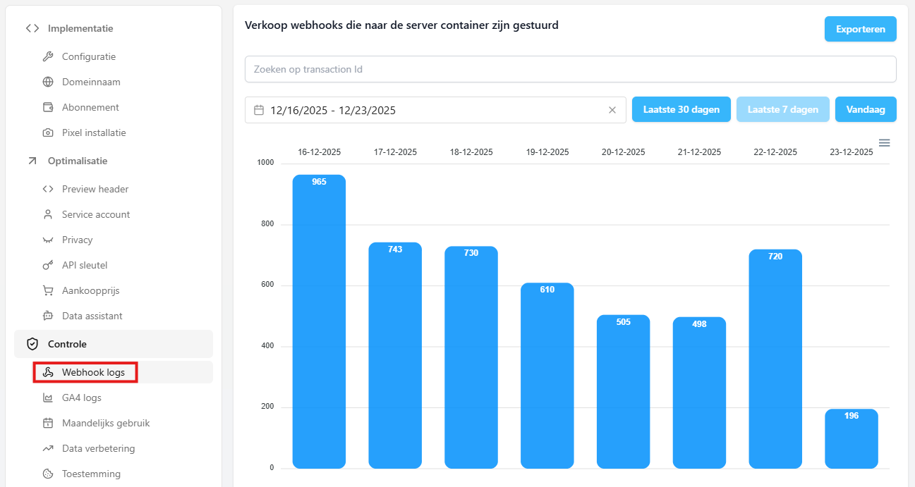 In de trytagging-omgeving heb je de mogelijkheid om de payload van alle ontvangen webhooks te bekijken. Dit doe je in de Webhook Logs.