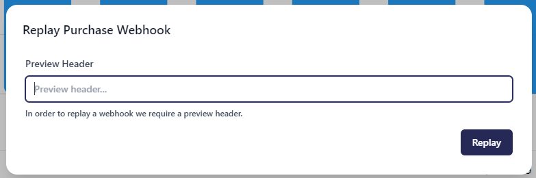 Om een Webhook opnieuw af te spelen, klik je op de knop van een specifieke webhook. Er opent dan een popup waarin je de preview header moet toevoegen.