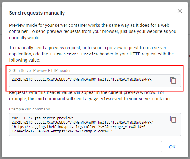 Kopieer de x-gtm-server-preview HTTP header en plak deze in het invoerveld binnen de Webhook Replay popup op de trytagging-omgeving.