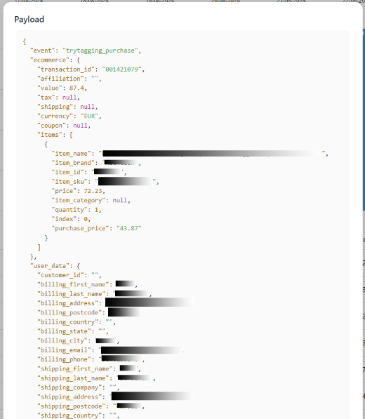 Wanneer je op de knop klikt om de payload te bekijken, wordt de payload van die specifieke webhook geopend. Hierin vind je alle verzonden informatie van de bezoeker en de order. Deze informatie wordt opgehaald vanuit het marketingobject dat gevuld wordt vanuit de DataLayer.