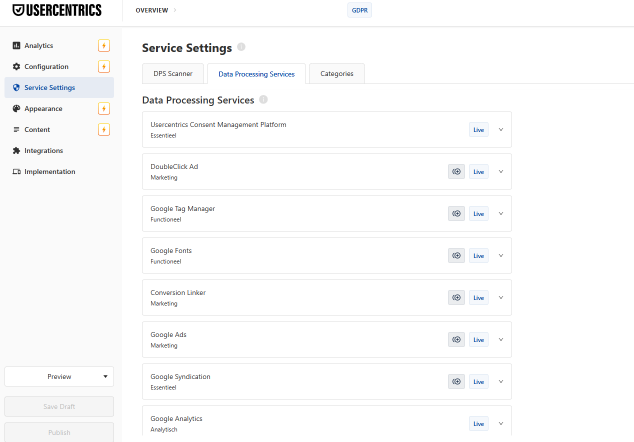 Daarna ga je naar de Data Processing Services instellingen onder Service Settings.