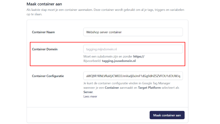Wanneer je een server container aanmaakt op trytagging, moet je een Container Domein invullen voor je server. Dit domein moet overeenkomen met het CNAME record dat je toevoegt aan je DNS-instellingen.