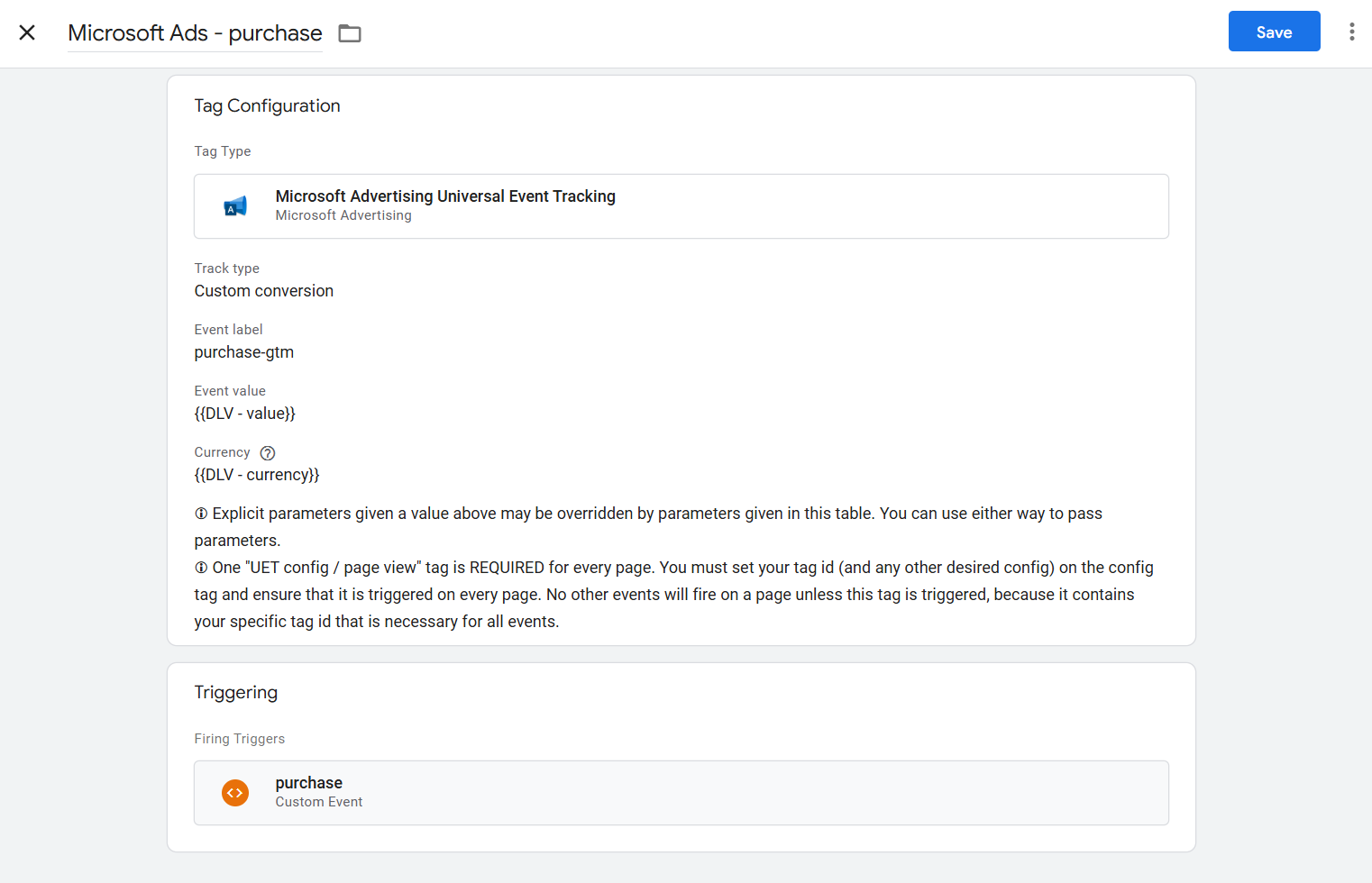 Geef deze tag de naam "Microsoft Ads - UET Tag" en sla de tag op.