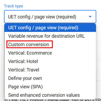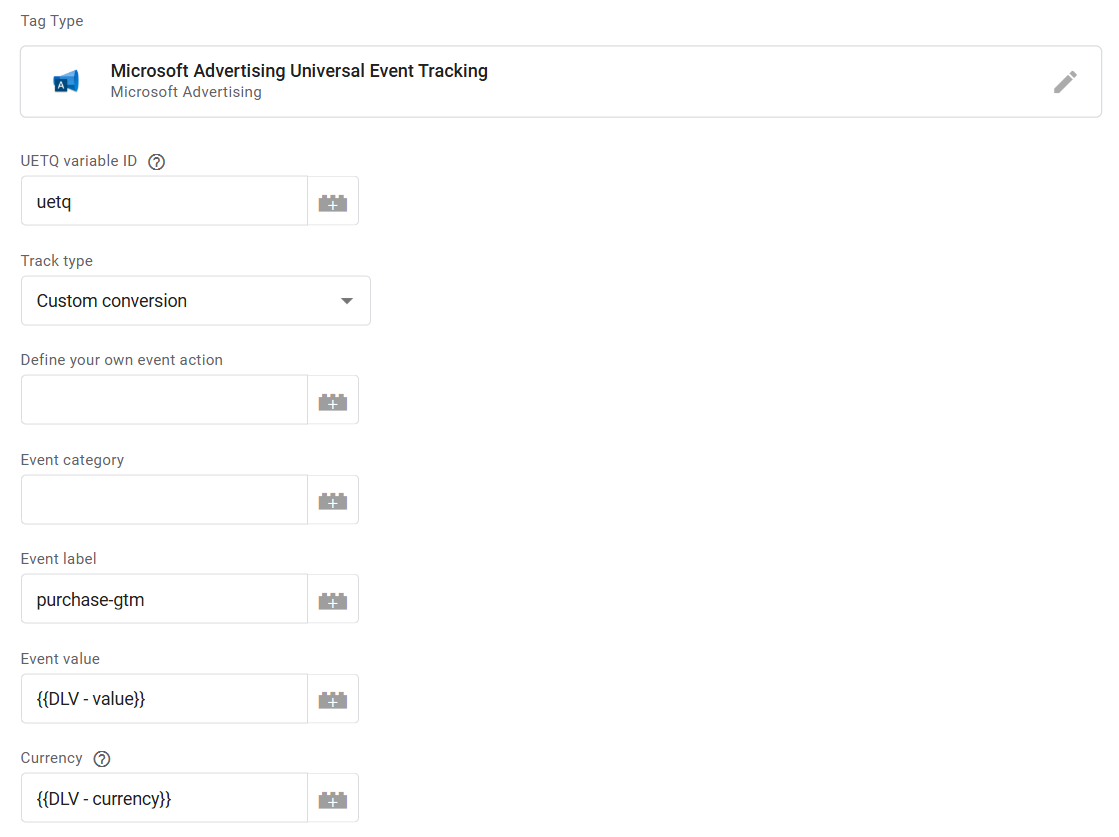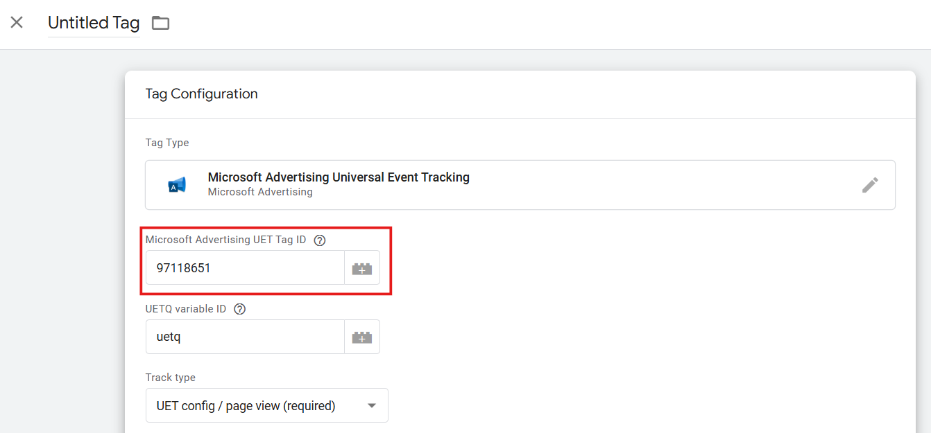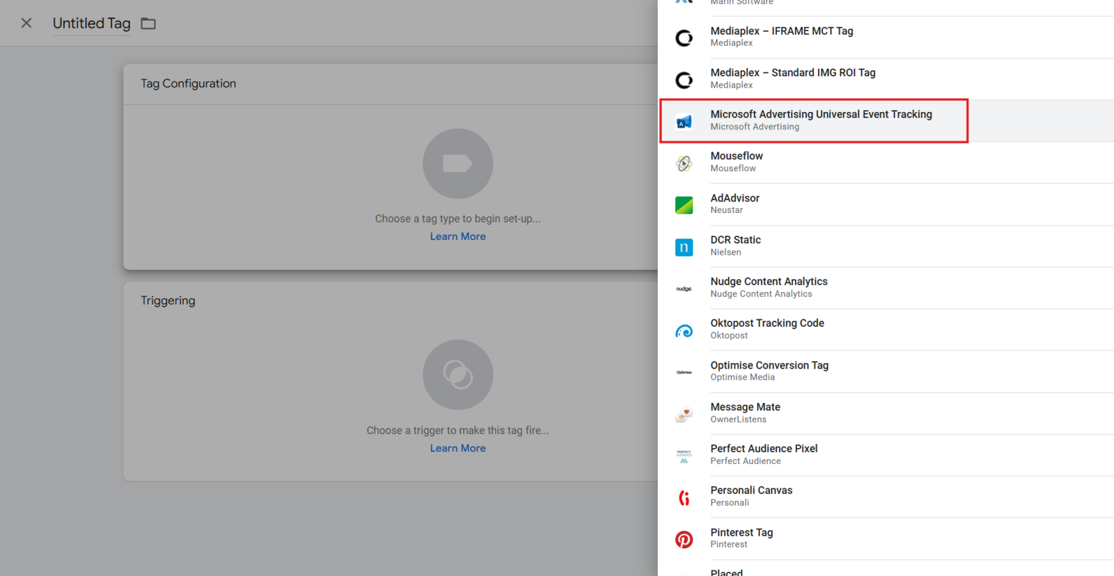 Selecteer Microsoft Advertising Universal Event Tracking als tagconfiguratie.