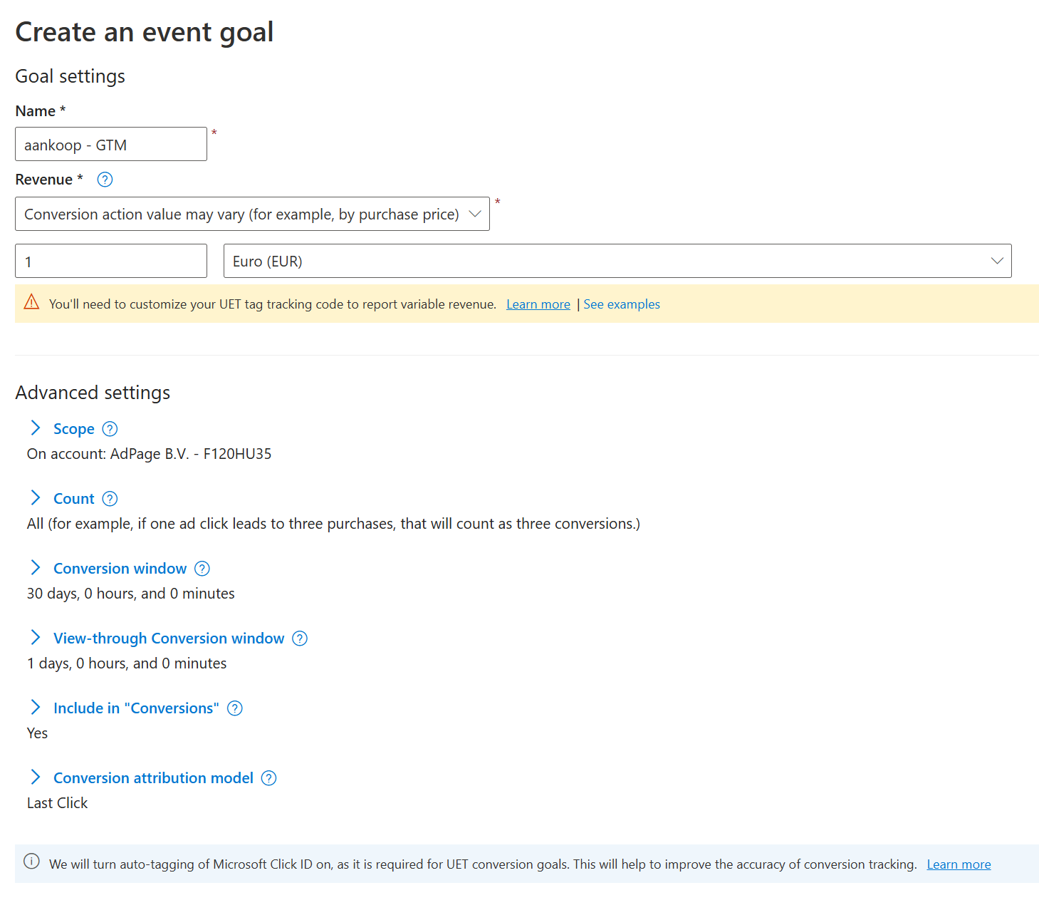 De UET tracking code is de configuratie voor je Ads account. Dit is te vergelijken met de Conversion Linker voor Google Ads of de Google Tag voor GA4. Dit is een verplichte tag die je in moet laden voordat je de conversietags in kan laden.