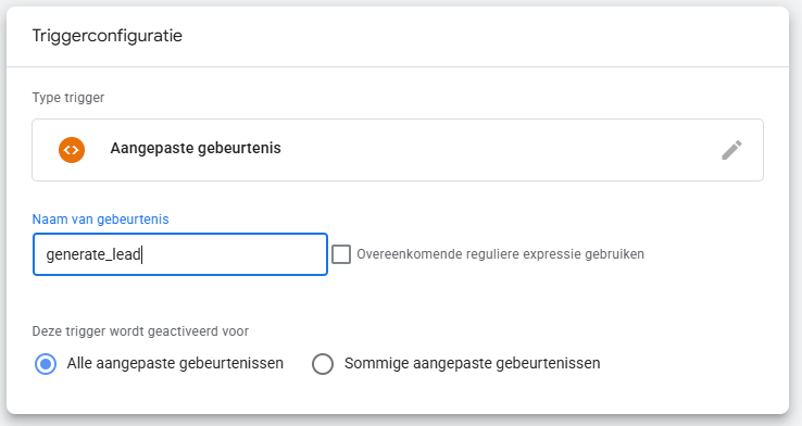 Selecteer de oranje optie Aangepaste gebeurtenis als trigger configuratie. Vul als gebeurtenisnaam de exacte naam in van je GA4 gebeurtenis waarop je deze tag wil laten activeren.