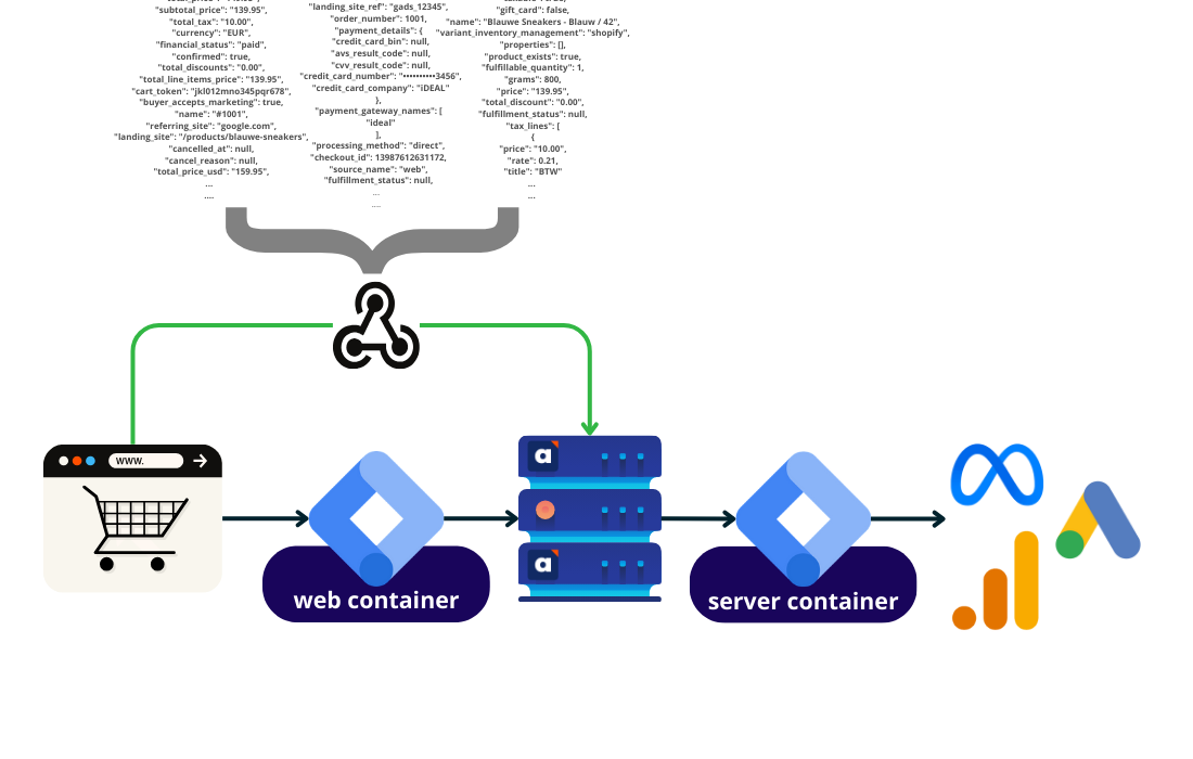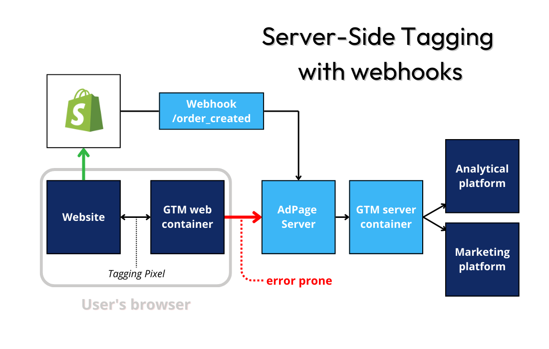 De AdPage backend-webhooks van Shopify, WooCommerce en Magento zijn een andere manier om een aankoop op de website te meten. Als je via een standaard Server-Side Tagging setup een aankoop meet, doe je dat doordat er een dataLayer event gepusht wordt in de browser van de gebruiker als deze op de bedankpagina van de site terecht komt. Maar als je deze aankoop via een backend-webhook meet, dan wordt er vanuit de backend van de webshop direct een signaal naar de server container verstuurd op het moment dat er een order aangemaakt wordt in die backend. De reden dat je backend-webhooks wil gebruiken komt vanwege 3 type bezoekers die aankopen op de webshop doen: