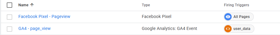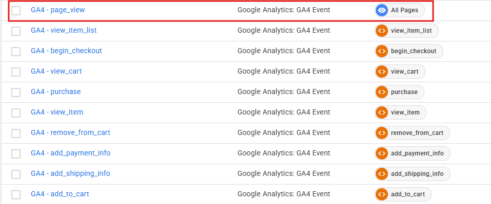 Check in het overzicht van je Tags op de GTM web container of je GA4 event tags hebt met een van de volgende trigger-iconen: