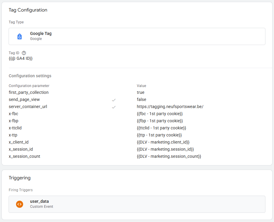 Het goede nieuws is dat je deze drie ID's consistent kunt overschrijven gedurende de hele klantreis. Op elke pagina vindt er namelijk een 'trytagging_user_data' dataLayer event push plaats. Dit event is specifiek ontworpen om deze drie ID's te kunnen overschrijven, waardoor je een naadloze integratie tussen je Server-Side Tagging en webhook-metingen mogelijk maakt. Deze IDs kan je binnen Google Tag Manager overschrijven via de Google Tag en in onderstaande stappen zullen deze stappen toegelicht worden.