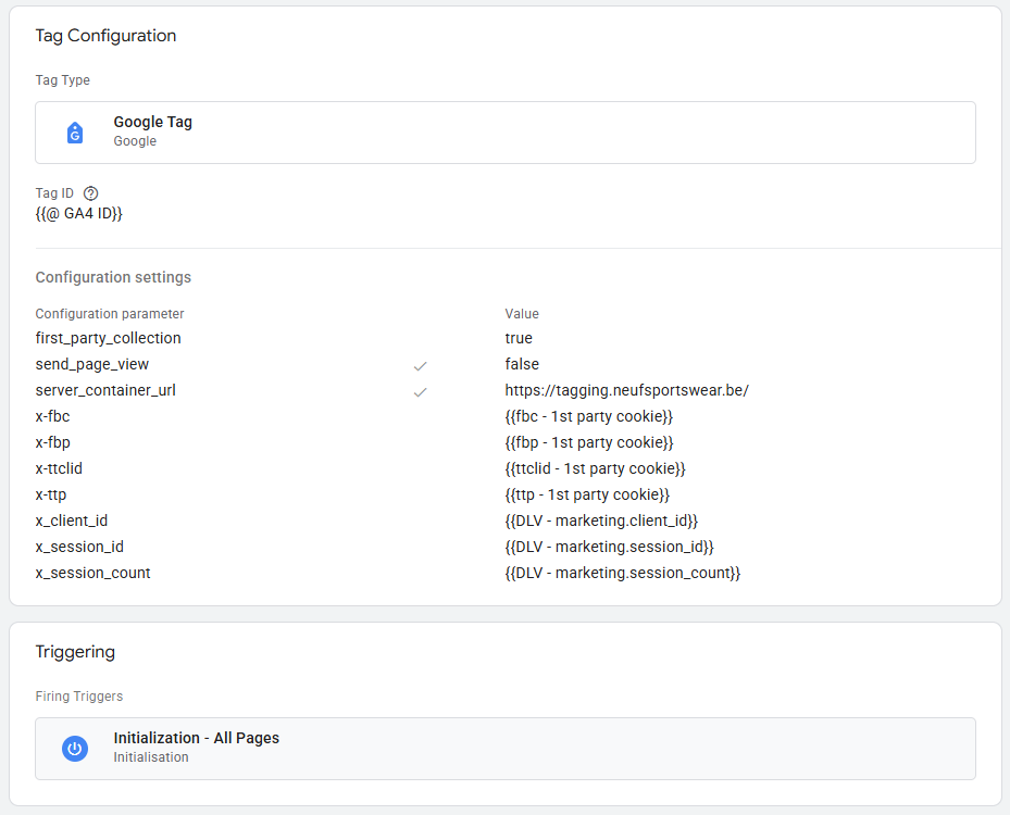 Nu ziet je Google Tag, als het goed is, er zo uit (het kan zijn dat je andere benamingen voor je variabelen gebruikt hebt):