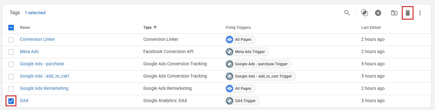 Selecteer je GA4 tag en verwijder deze