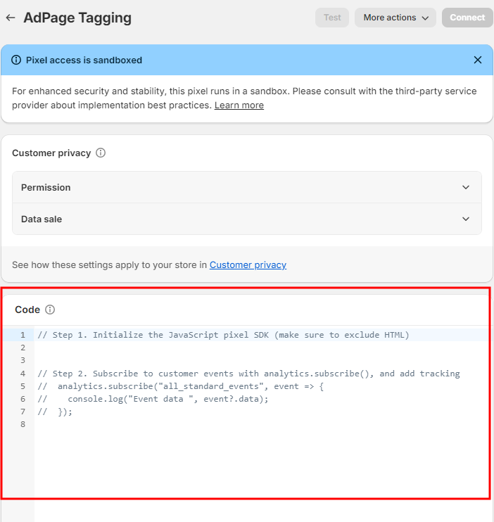 Plak het customer events script uit je Tagging Pixel instructies in je aangemaakte customer events pixel binnen Shopify.