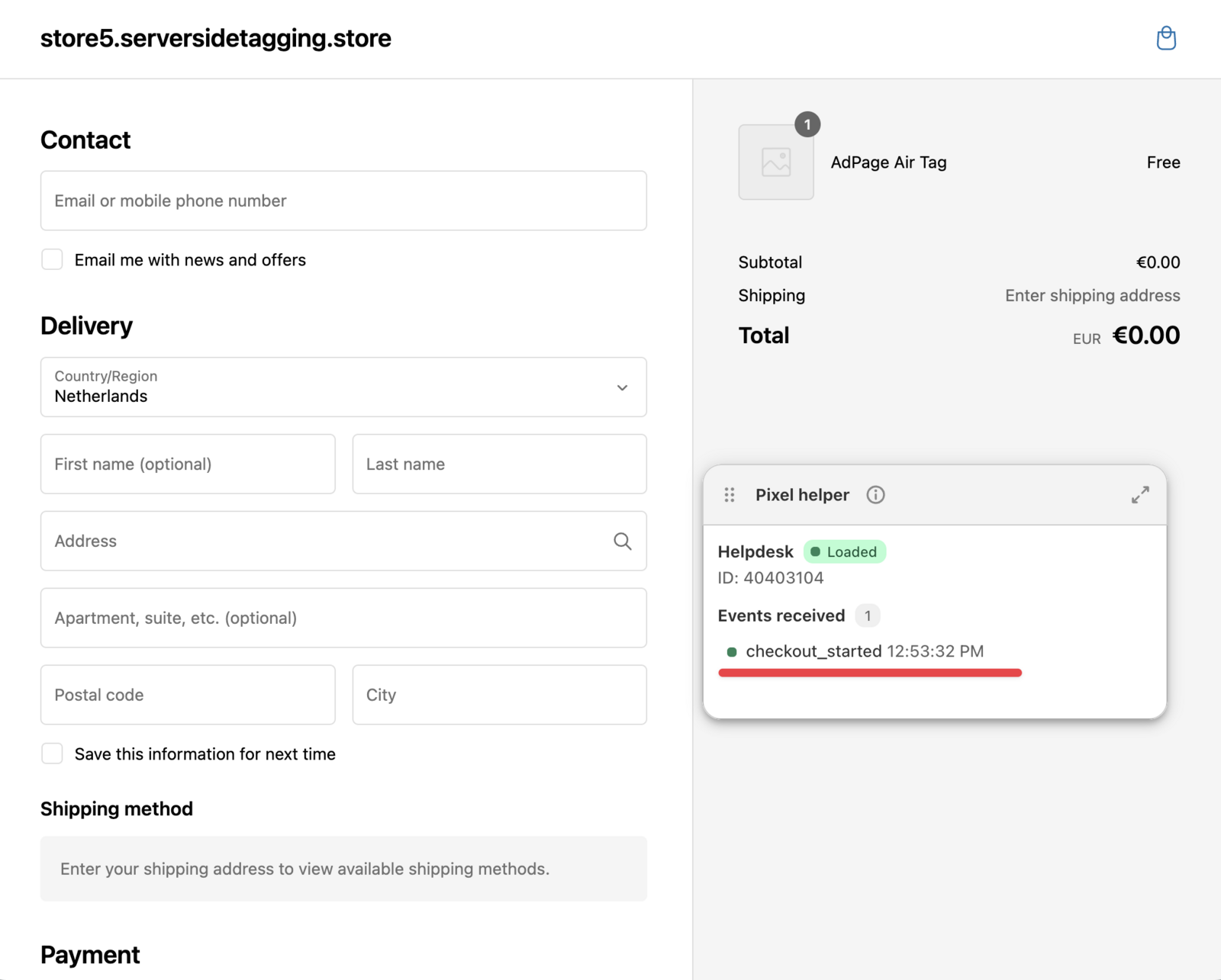 Als de pixel helper aangeeft dat het evenement checkout_started is gemeten, is de installatie van de pixel succesvol geweest.