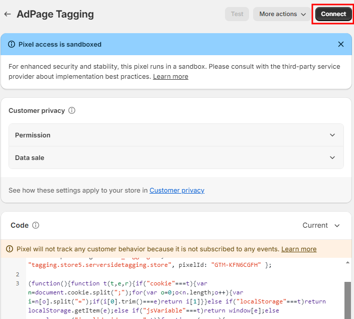Druk vervolgens op connect om je aangepaste pixel te activeren.