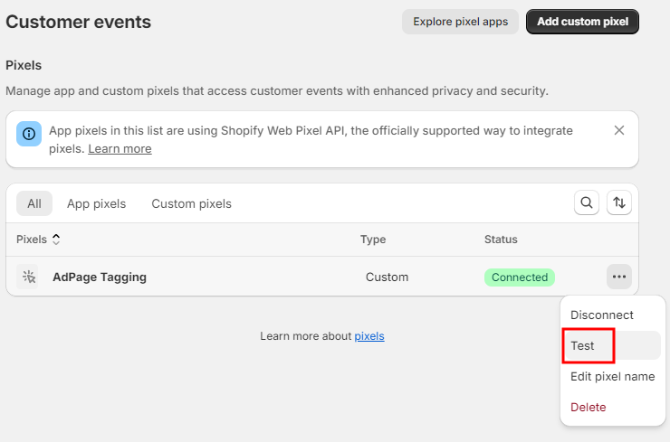 Ga naar de customer events in Shopify en klik naast je zojuist geïnstalleerde pixel op de drie puntjes en daarna op Test.