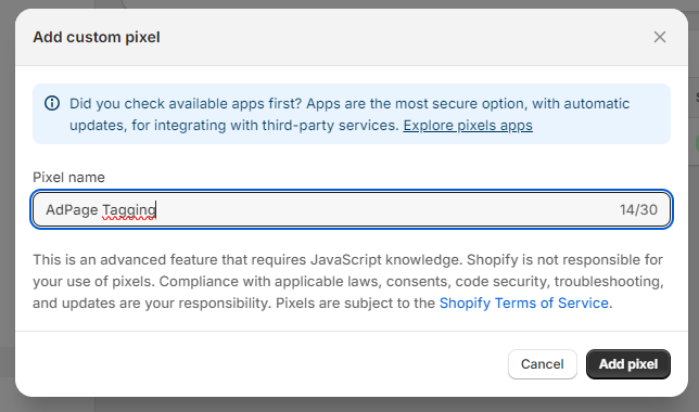 Voeg een aangepaste pixel toe. Geef deze een duidelijke naam, bijvoorbeeld "AdPage Tagging".