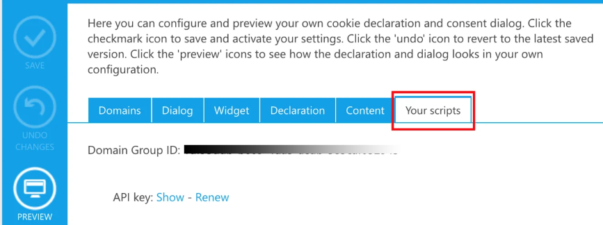 In het invoerveld Cookiebot ID vul je jouw Cookiebot ID in. Dit kun je vinden door de Domain Group ID te kopiƫren uit het tabblad Your Scripts in je Cookiebot account.