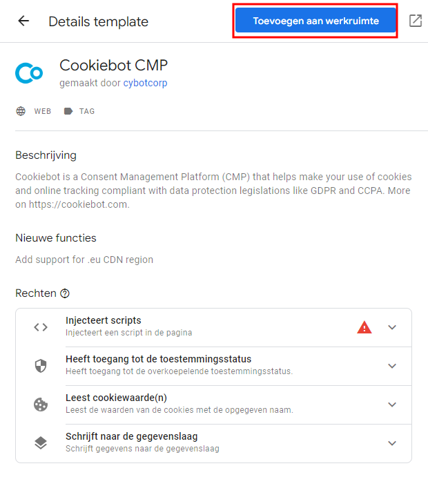 Gebruik de zoekfunctie om de template van Cookiebot te vinden. Voeg deze template toe aan je werkruimte.