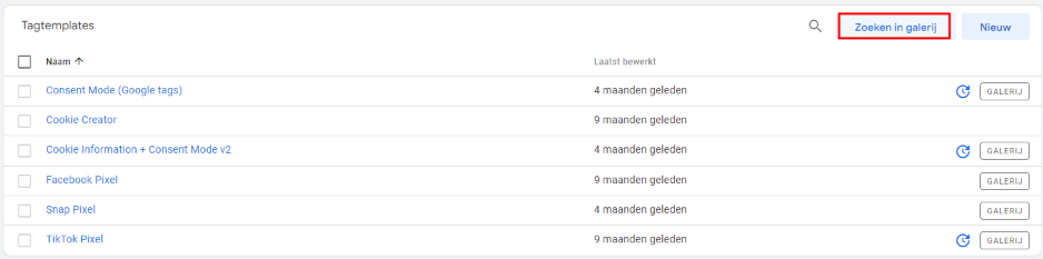 Ga naar Templates en klik op Zoeken in Galerij onder de Tagtemplates.