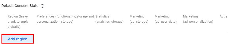 Als je de Default Consent State (alles geweigerd voor nieuwe bezoekers) aan wil passen, maak je een nieuwe Region aan en vul je hier de standaard consent in die een nieuwe gebruiker heeft voordat ze cookies kunnen weigeren of accepteren.