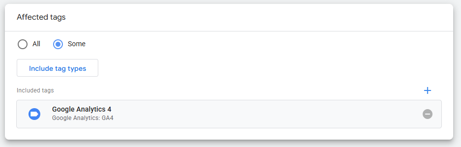 Zorg er nu voor dat deze transformation wordt toegevoegd aan je GA4 Tag binnen de server container. Dat doe je door binnen je transformation te klikken op Affected tags, daarna op Some, en je GA4 tag te selecteren als Include Tags.